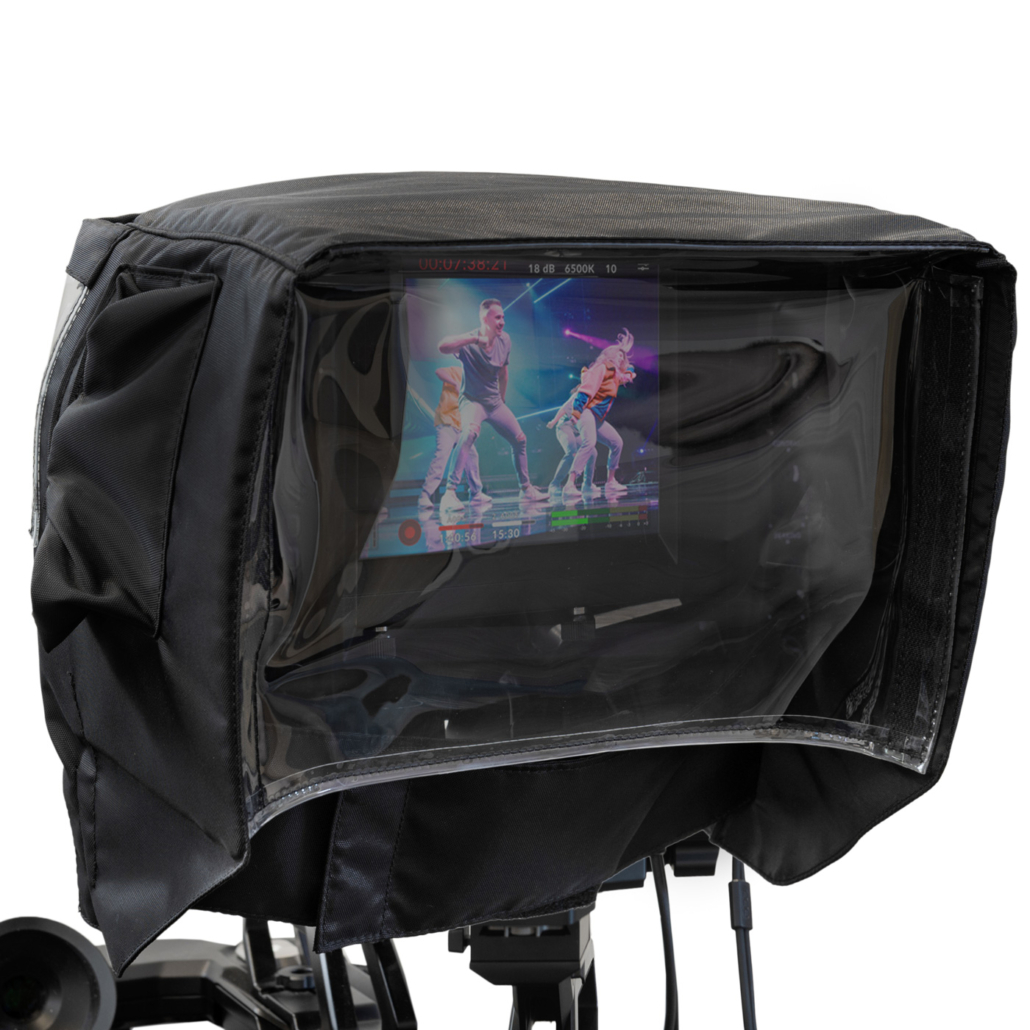 Universal rain cover for 7″ Viewfinder Monitors. The cover has an Easy-on-Easy-off construction with hook and loop fasteners. The side handles can be reached through the cuffs on the left and right side of the cover.