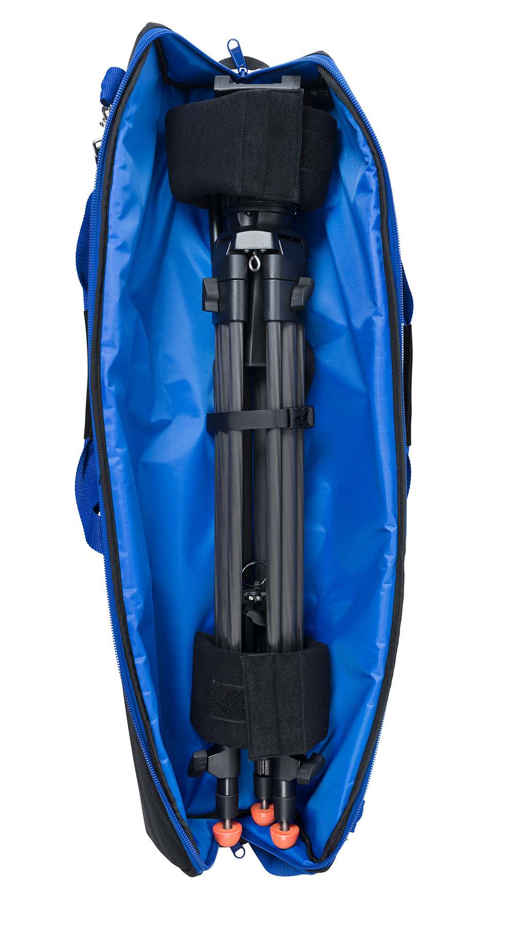 Straps and padded velour cushions with hook and loop fasteners keep the tripod safely in place. An easy locator icon points to which side the fluid head should be placed.